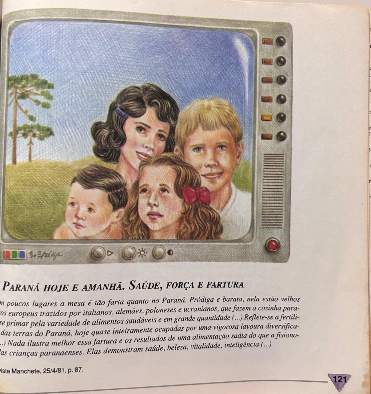 A imagem que fecha a obraé uma ilustração de uma cena que se passa supostamente num aparelho de televisão. Na tela, quatro crianças brancas, dois meninos e duas meninas de diferentes idades, aparecem sorrindo num ambiente aberto, um terreno coberto por uma vegetação rasteira, ladeado por duas Araucárias (símbolos do Paraná), e o céu azul ao fundo. O texto que acompanha a imagem, intitulado “Paraná hoje e amanhã. Saúde, força e fartura” foi extraído de uma revista brasileira de grande circulação nos anos de 1980, a Manchete. Ao tratar da fartura que, segundo o texto da revista, caracteriza o Paraná, afirma o seguinte: “Nada ilustra melhor essa fartura e os resultados de uma alimentação sadia do que a fisionomia das crianças paranaenses. Elas demonstram saúde, beleza, vitalidade, inteligência” (Schmidt, 1996, p. 121). Como a imagem denota, o Paraná, ao final, é uma terra de fartura, marcada pelos hábitos alimentares saudáveis trazidos pelos imigrantes europeus e onde triunfou o branqueamento da população.